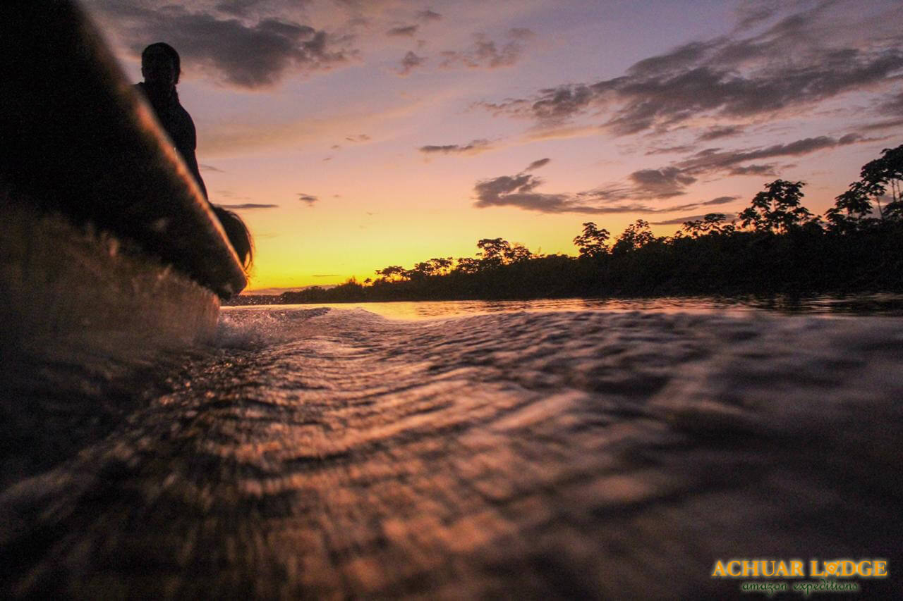Mit dem leisen Kanu kommen wir dann zur Abenddämmerung in der Lodge an.